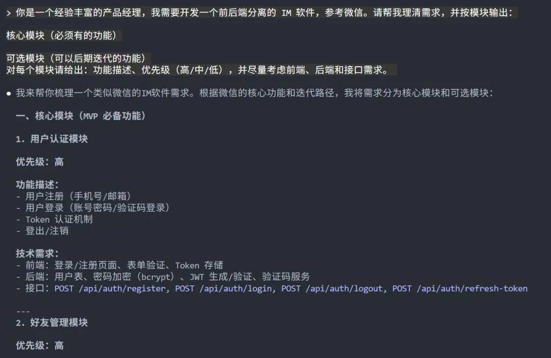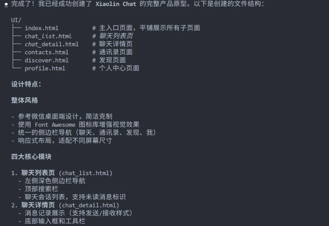 有了这个基础需求文档,就可以开始做原型设计了。我给GLM-4.7的提示词很简单:核心要求是UI风格参考微信,必须包含聊天、通讯录、发现和我的四大核心页面。其他提示词只是辅助作用,目的是让原型设计更合理、更贴近真实产品。