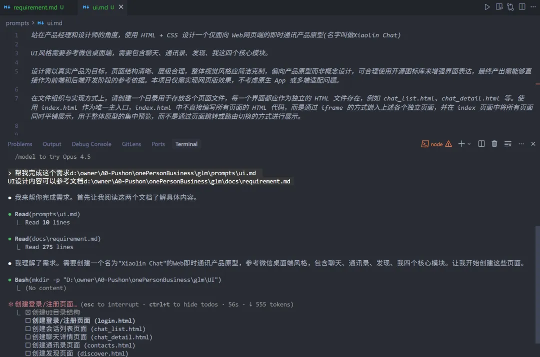 这里我说一个结论:GLM-4.7非常强,GLM独自完成原型设计到前后端落地,最终实现一个微信风格的 IM 网页APP