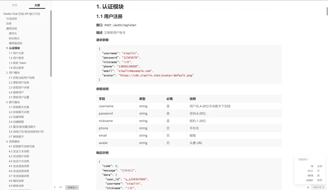 恐怖的是,这份接近3000行的接口文档格外细致,参数、返回值和示例都齐全,前端和后端都能直接用。要是让我自己写,别提得多痛苦了。