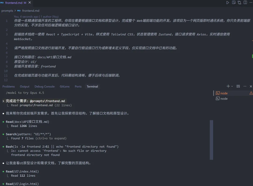 这里要额外提一点,因为我们最开始就有完整的原型设计和接口契约,所以可以开两个终端,让GLM-4.7同时开发前端和后端。