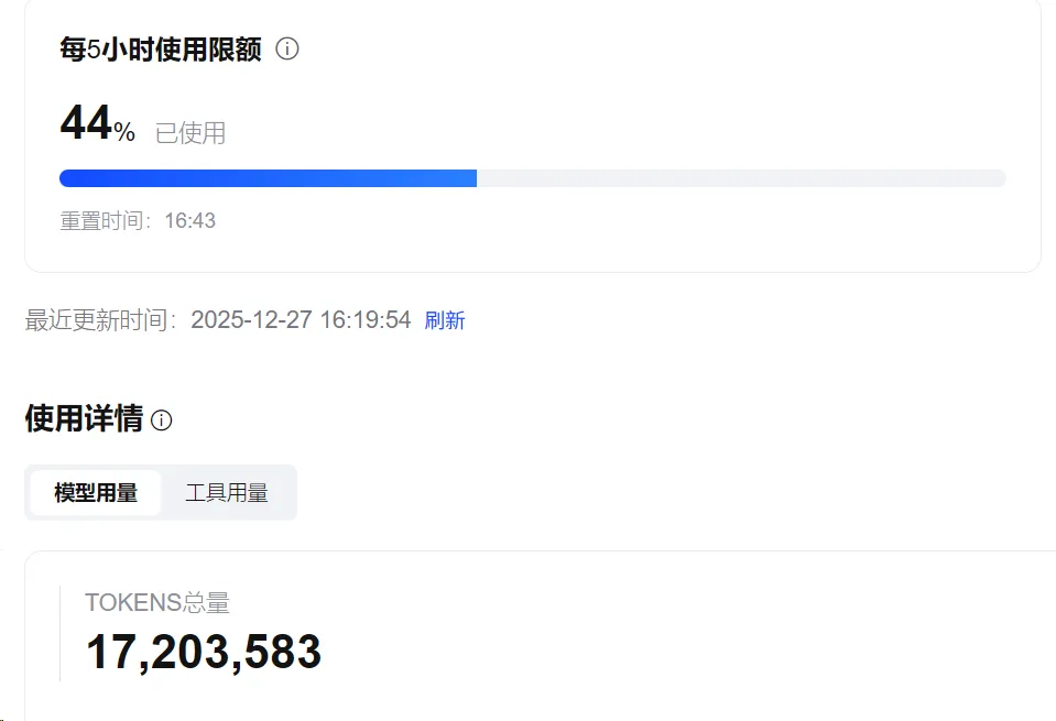 其实完全不用怕。我用的是最便宜的GLM Coding Lite,以前看着"三倍Claude Pro套餐用量"也没啥感觉。可我打开控制台一看,最近5小时用了44%,总共1700万Token,理论上一天能用上亿Token,对于一般的项目开发来说,很难用完,不得不说,GLM性价比是真的高。