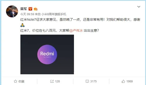 红米Note7发布了好几天 ,作为红米独立的第一款产品,还是得到了不少认可,但是雷军可没歇着。这可不,我们敬业的雷总今天周末也没休息,在微博问大家对于红米7的期待呢。