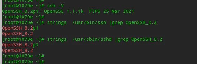 strings /usr/sbin/sshd |grep OpenSSH_8.2 ##查看对应字符串strings /usr/bin/ssh |grep OpenSSH_8.2 ##查看对应字符串