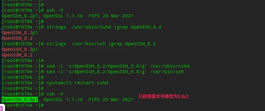 sed -i 's/OpenSSH_8.2/OpenSSH_9.8/g' /usr/sbin/sshd ##修改版本号sed -i 's/OpenSSH_8.2/OpenSSH_9.8/g' /usr/bin/ssh ##修改版本号systemctl restart sshd ##重启服务