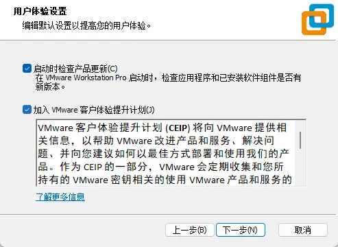 根据自身情况选择“启动时检查产品更新”和“加入VMware客户体验提升计划”复选框,然后点击“下一步”按钮。
