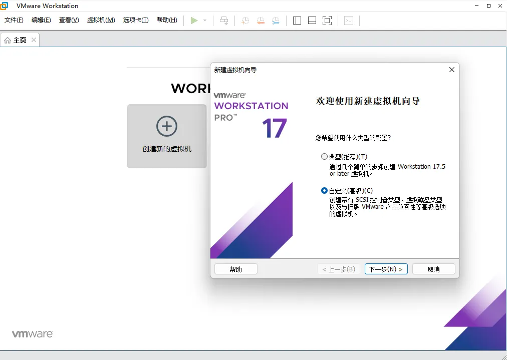 点击VMware Workstation 主界面“创建新的虚拟机”,然后选择“自定义(高级)”复合框,然后点击“下一步”按钮。