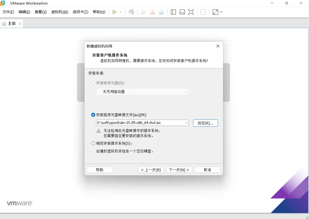 安装客户端操作系统界面中,在安装程序光盘映像文件(iso),浏览选择中下载好的OpenEuler镜像文件,然后点击“下一步”按钮。