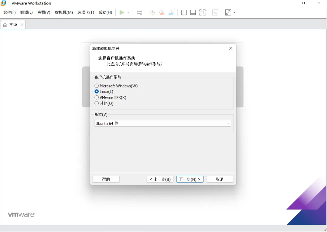 选择客户端操作系统版本,选择复合框“Linux”,版本下拉框选中“Ubuntu 64位”,然后点击“下一步”按钮。
