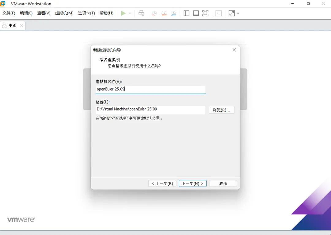命名虚拟机中,虚拟机名称根据实际情况而定,位置也根据实际情况而定,然后点击“下一步”按钮。