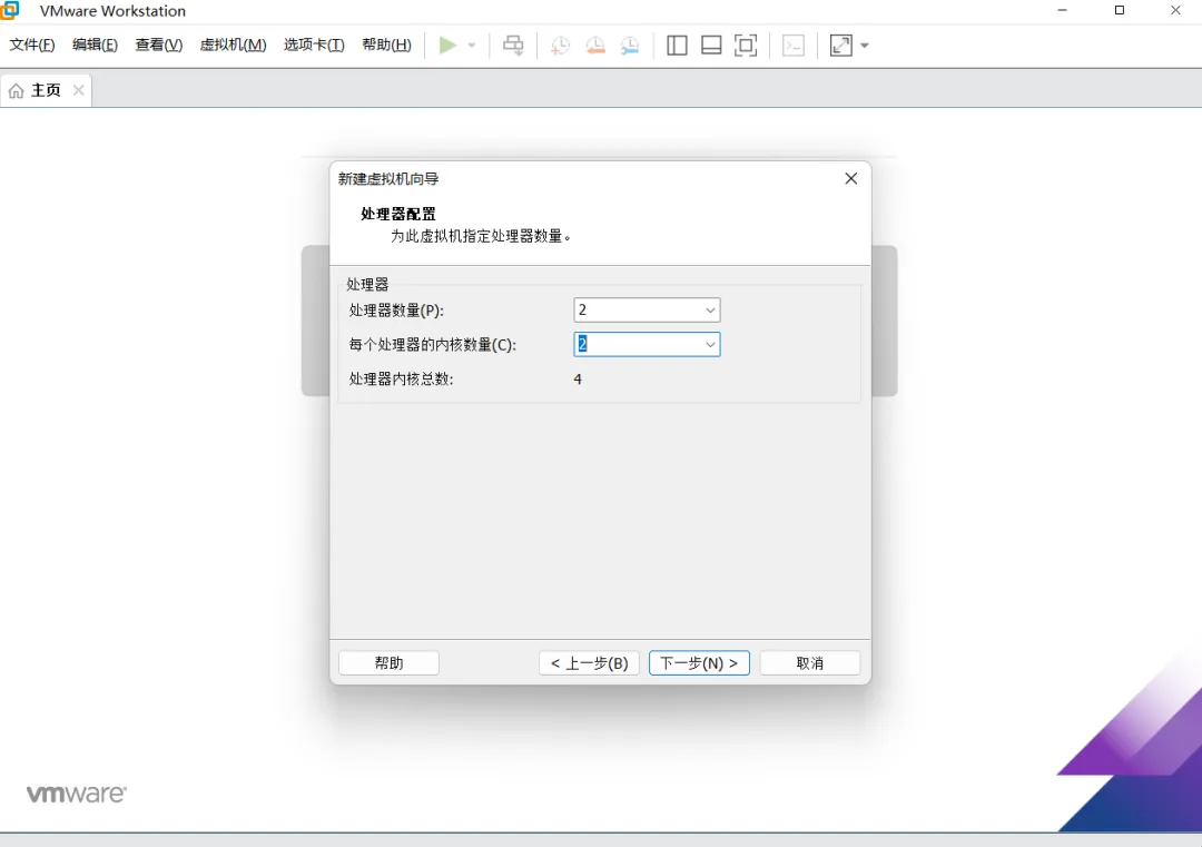 虚拟机处理器配置界面,这边根据宿主机配置而定,然后点击“下一步”按钮。