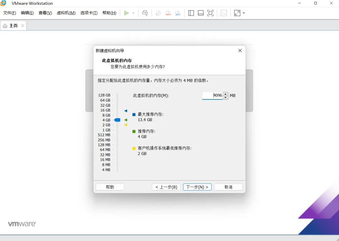 虚拟机内存配置界面,这边根据宿主机配置而定,然后点击“下一步”按钮。