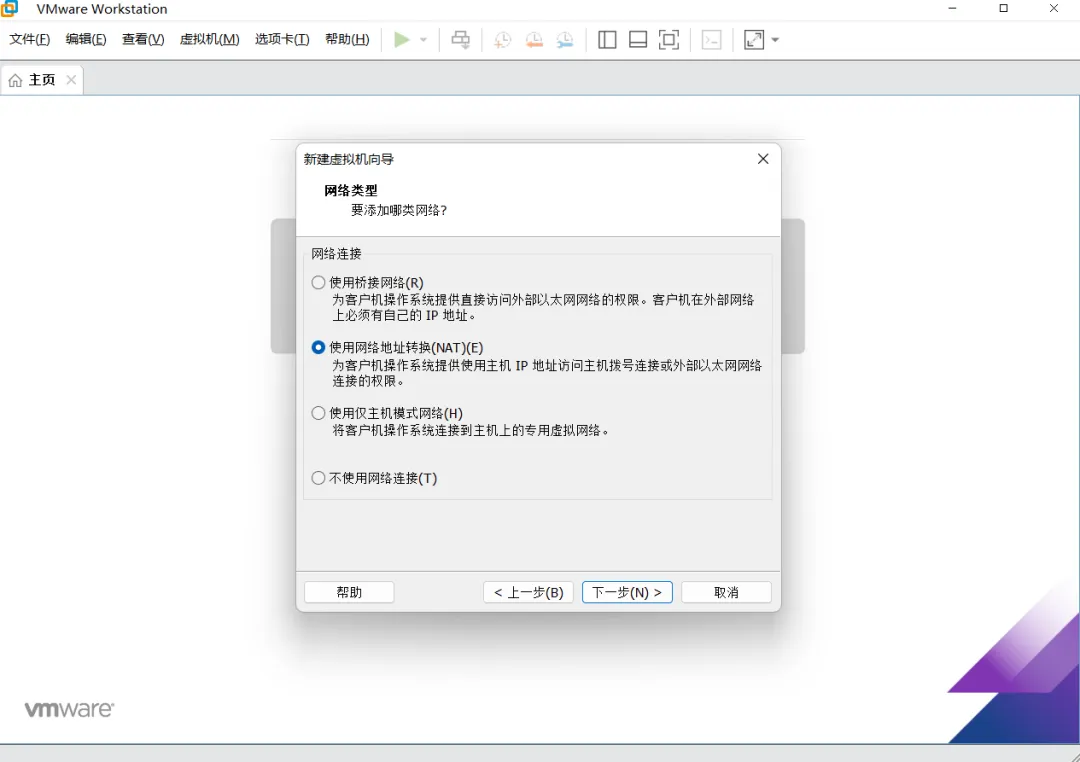 虚拟机网络类型配置界面,这边根据实际需求而定,然后点击“下一步”按钮。