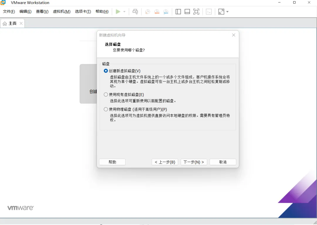 选择磁盘界面,这边属于首次创建,所以选择“创建新虚拟磁盘”,如有其他条件根据要求而定,然后点击“下一步”按钮。