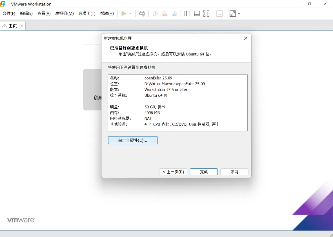 虚拟机配置配置完后,点击“完成”按钮。