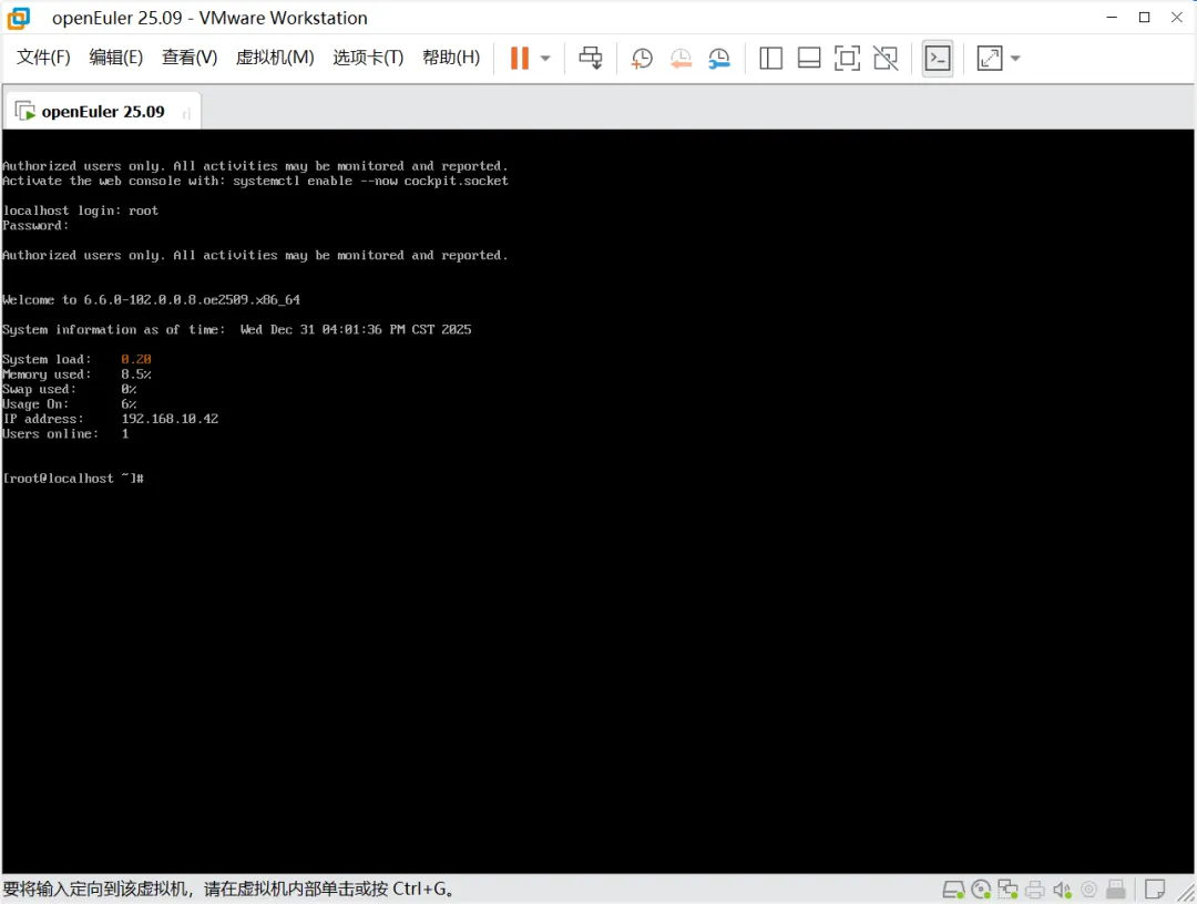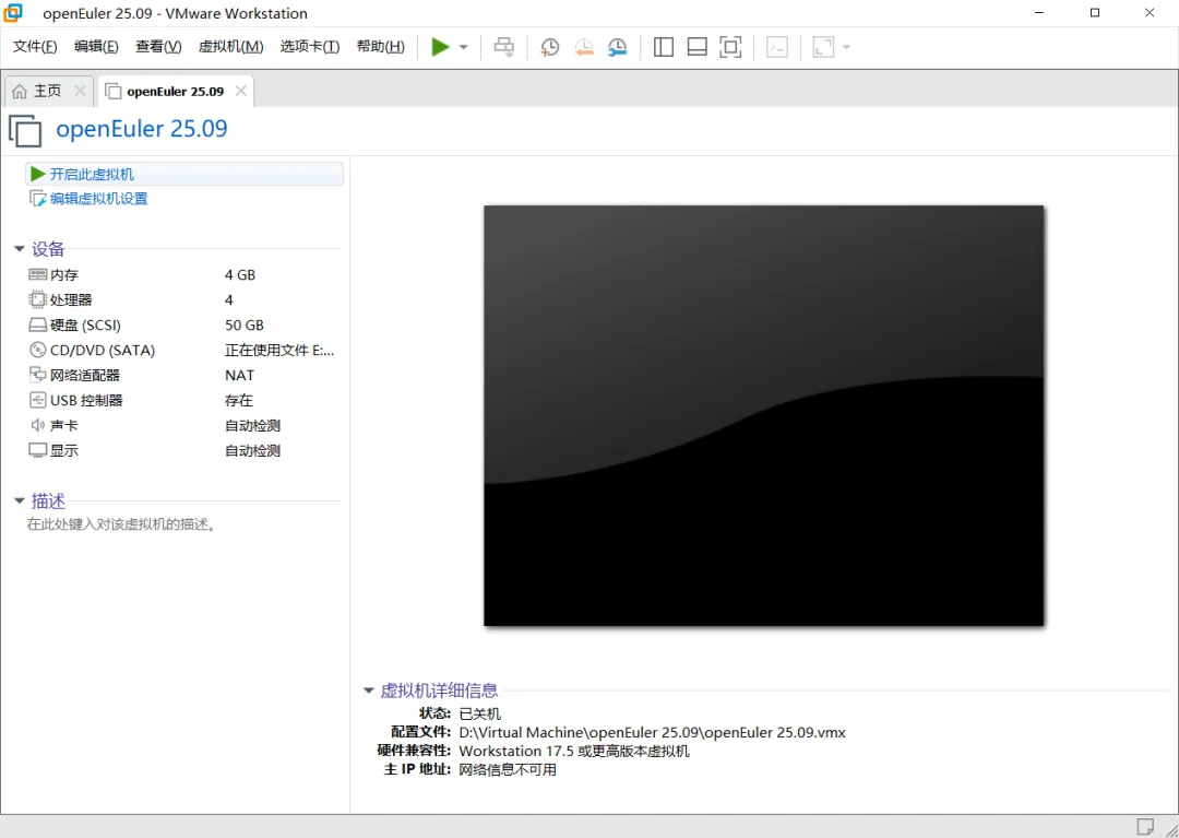 VMware Workstation主界面能看到已创建好的openEuler,点击“开启此虚拟机”按钮。
