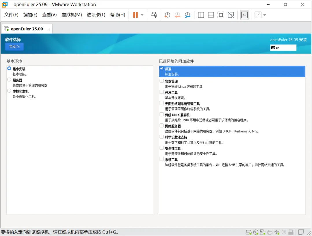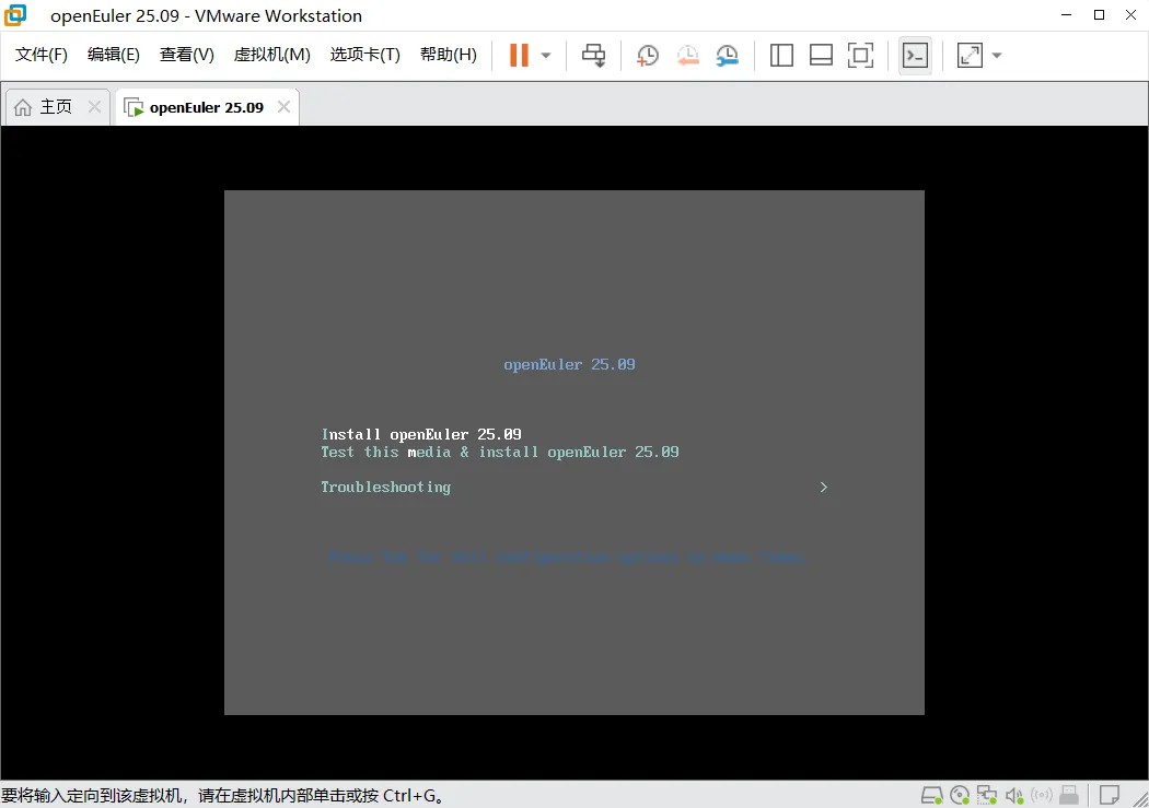 菜单栏界面选择第一列Install openEuler 25.09 安装openEuler 25.09,第二列Test this meida & install openEuler 25.09作用为校验镜像文件(或光盘)完整性后再安装,第三列Troubleshooting作用为启动救援模式。