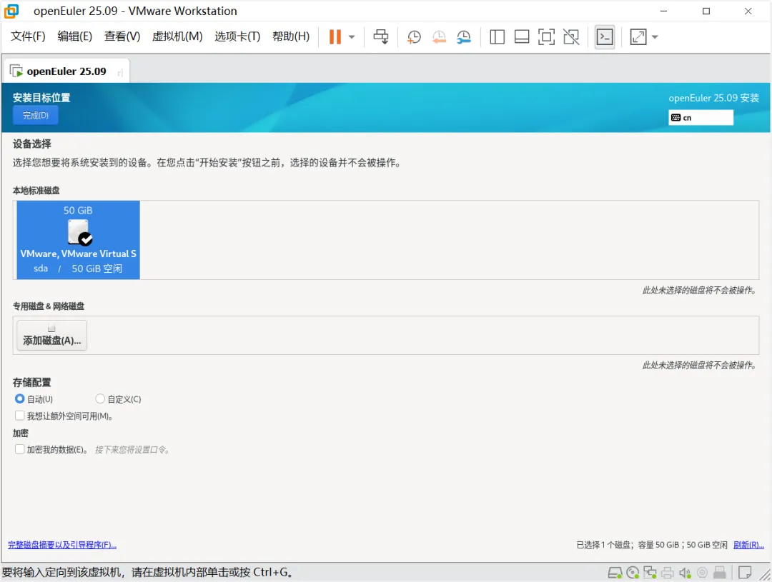 安装目标位置选择,这边选择第一块磁盘,然后点击“完成”按钮。