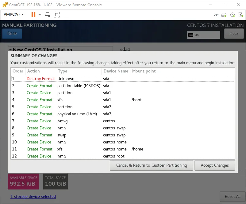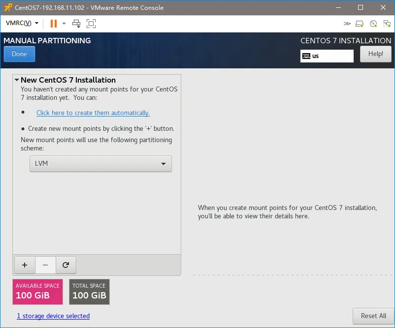 4.13、磁盘分区,先点击“INSTALLATION DESTINATION”再选择“I will configure partitioning”,点击“Done”;点击“Click here to create them automaticaaly”自动创建分区,分区方案默认选择“LVM”即可