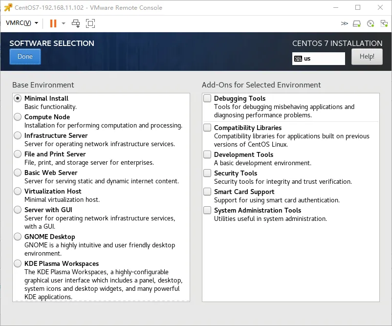 4.16、点击“Software Selection”选择最小安装“Minimal Lnstall”,再点击“Done”