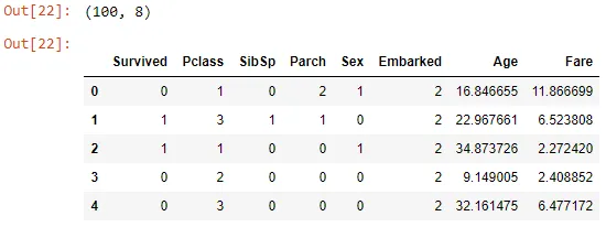 这种方法的一个缺点是变量之间的所有交互都丢失了。例如,假设在原始数据集中,女性(Sex= 1)存活的机会(Survived= 1)比男性(Sex= 0)高,而在生成的数据集中,这个信息丢失了,其它变量之间可能存在的关系也会丢失。