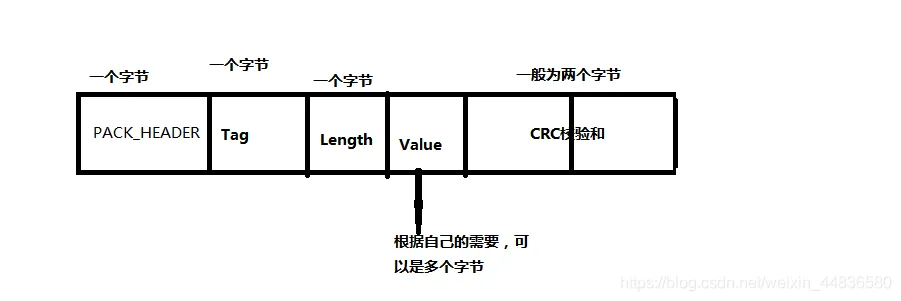装包的过程其实很简单,只要将你的数据按照包头(PACK_HEADER)、Tag(Type)-Length-Value、校验和的顺序将每个字节按十六进制的形式装进去,形成一个字节流发送出去,如下图:PACK_HEADER自己定义(我定义为0xFD),大小通常为一个字节;Tag也是自己定义,通常为一个字节;Length的大小要看你的数据所占用的字节大小,它的大小为包头大小+Tag大小+Length大小+校验和大小+数据字节大小,自身一般占用一个字节;crc校验和一般占两个字节。crc校验有兴趣可以自己学习,本人也不是很懂,用别人的源码。知道了怎么装包,下面来解释一下**为什么要加包头和校验和进去:**举一个例子,如果我们不加头和尾,要发送的数据为0x01 0x03 0x3c,接收端就会按照Tag(Type)-Length-Value顺序进行解析,知道数据的类型为01,长度为3,值为3c。但是发送的过程中也有可能数据丢失或者混入了其他数据,这时数据有可能会变为0x00 0x01 0x56 0x03 0x23,这时接收端按照之前的顺序解析就会出错,当我们加上头的时候,接收端解析的时候会先找到包头,然后按顺序解析,但是这样还是有出错的可能,但是加上crc校验和之后,crc根据接收到的数据计算出一个校验和,用来和装包装进去的校验和进行比较,如果相同说明这一帧数据正确,接收端才会开始解析数据,如果不正确就不解析。下面是我将获取到的温度进行装包的代码: