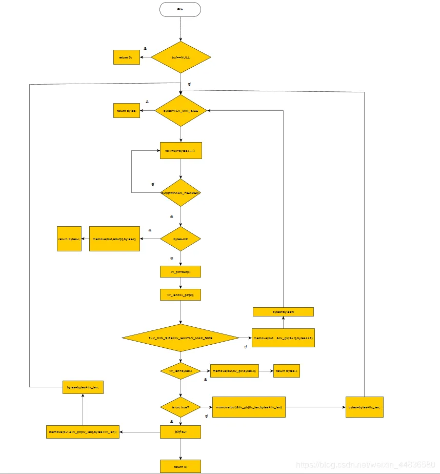 intunpacktlv(char *buf,int bv){ int i; int tlv_len; char *ptr=NULL; float t=0.0; float n,m; unsigned short crc16; unsigned short crc; if( !buf ) { printf("Invailed input!\n"); return 0; } if( buf==NULL ) { printf("buf is NULL!\n"); return 0; } printf("buf is not NULL\n");go_on: if( bv<TLV_MIN_SIZE ) { printf("buf 不完整\n"); return bv; } printf("buf is good!\n"); for(i=0;i<bv;i++) { if( (unsigned char)buf[i]!=PACK_HEADER ) { continue ; } printf("\nFind header!\n"); if( bv-i<2 ) { printf("can not find length...\n"); memmove(buf,&buf[i],bv-i); bv=bv-i; goto go_on; } ptr=&buf[i]; tlv_len=ptr[2]; printf("tlv length:%d\n",tlv_len); if( tlv_len<TLV_MIN_SIZE || tlv_len>TLV_MAX_SIZE ) { printf("tlv_len is error!\n"); memmove(buf,&ptr[2+1],bv-i-2); bv=bv-i-2; goto go_on; } printf("tlv_len is ture!\n"); if( tlv_len>bv-i ) { printf("Error!\n"); memmove(buf,ptr,bv-i); return bv-i; } crc16=crc_itu_t(MAGIC_CRC,(unsigned char*)ptr, tlv_len-2); crc=bytes_to_ushort((unsigned char*)&ptr[tlv_len-2],2) ; if( crc!=crc16 ) { printf("crc is not ture!\n"); memmove(buf,&ptr[tlv_len],bv+tlv_len); bv=bv+tlv_len; goto go_on; } printf("crc is true!\n"); m=ptr[3]; n=((float)ptr[4])/100; //printf("%d\n",ptr[4]); //printf("0x%02x \n",(unsigned char)ptr[4]); t=m+n; printf("Temperature is:%f\n",t); printf("\n"); memmove(buf,&ptr[tlv_len],bv-i-tlv_len); bv=bv-i-tlv_len; goto go_on; } return 0;}
