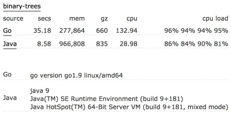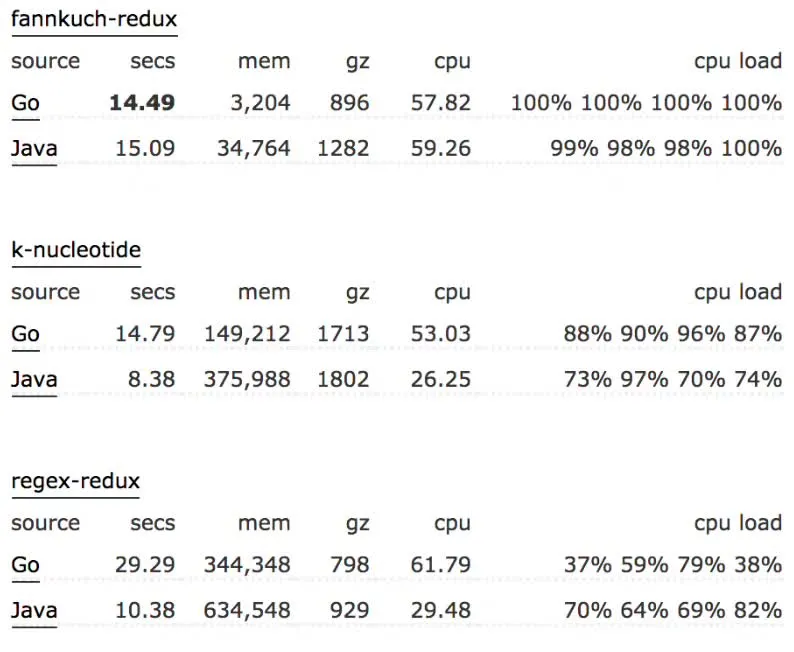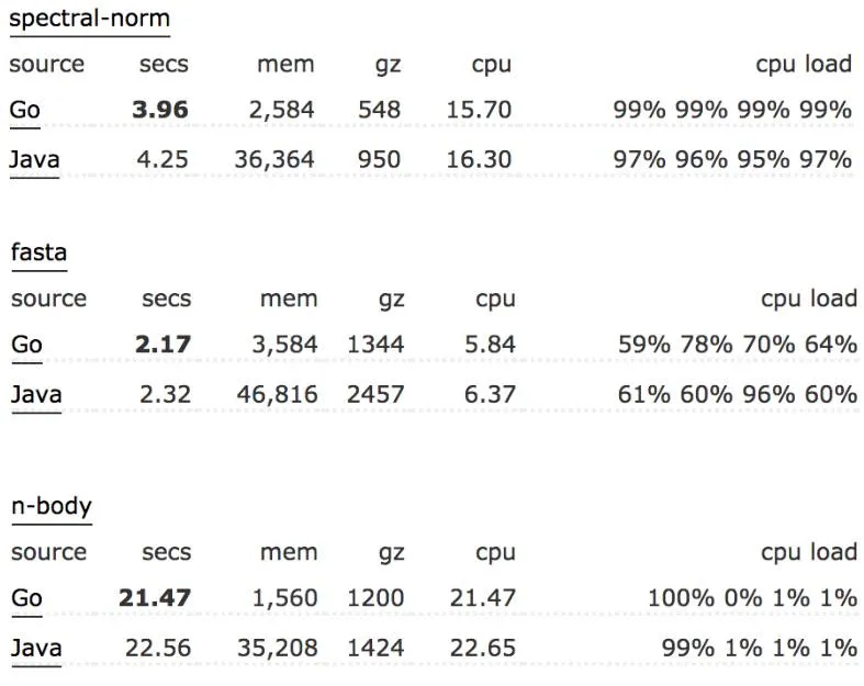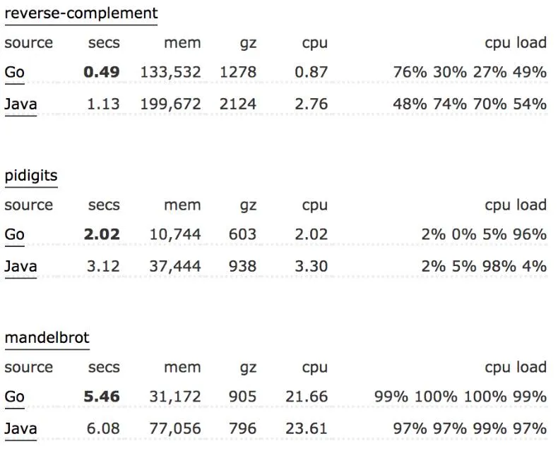 Go 极其地快。其性能与 Java 或 C++相似。在我们的使用中,Go 一般比 Python 要快 30 倍。以下是 Go 与 Java 之间的基准比较: