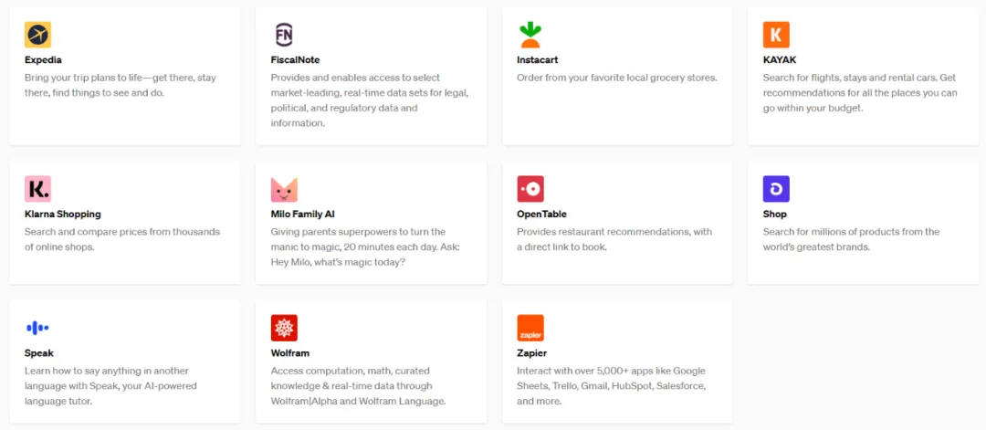 目前,插件系统还处于 alpha 测试期,首批参与插件创建的厂商包括 Expedia、FiscalNote、Instacart、KAYAK、Klarna、Milo、OpenTable、Shopify、Slack、Speak、Wolfram 和 Zapier。