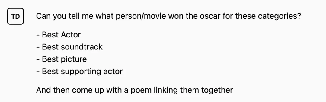 在 OpenAI 展示的示例中,ChatGPT 会检索关于最新一届奥斯卡颁奖典礼的信息,再用其最擅长的“写诗”能力加以改编。