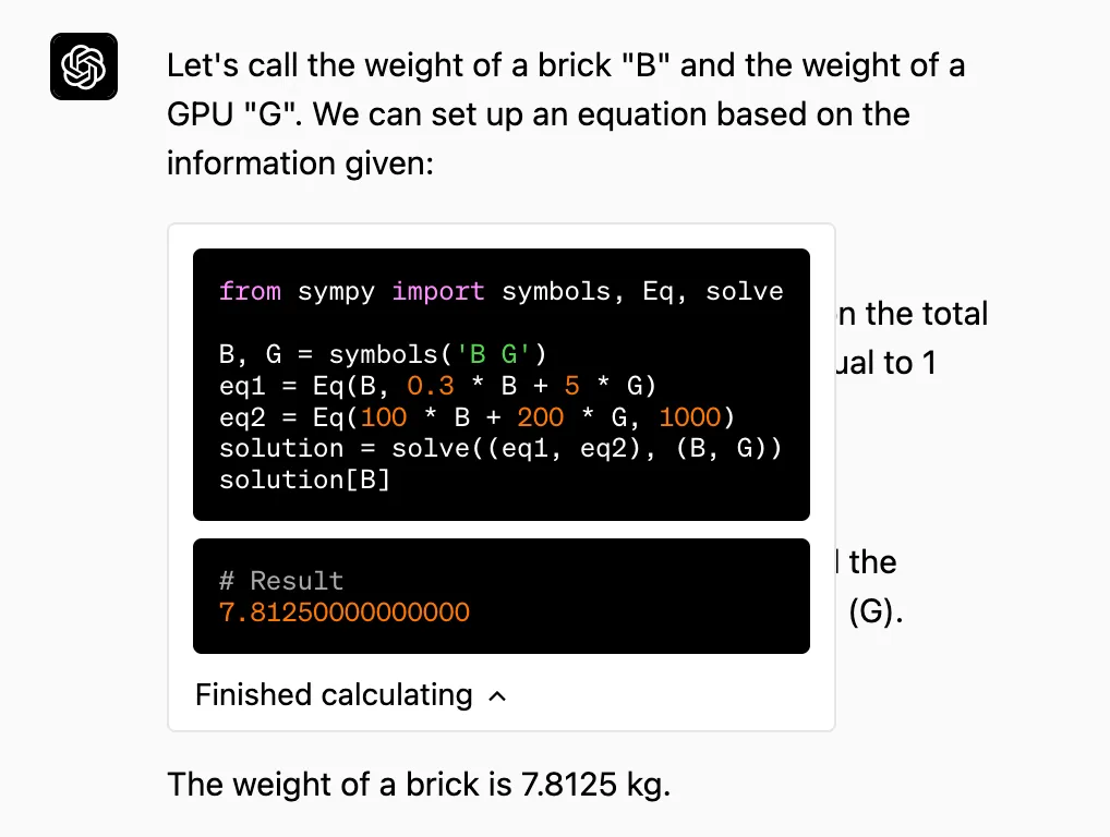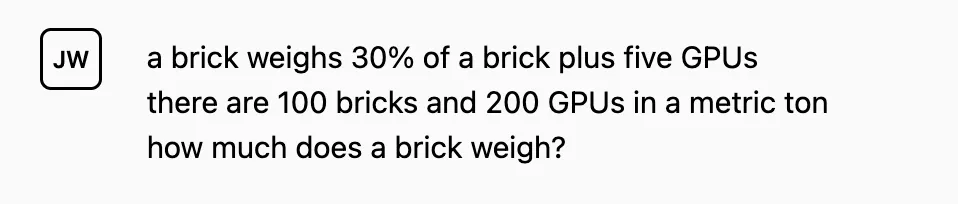 比如,当问到:一块砖的重量是这块砖自身 30% 的重量与 5 个 GPU 的重量之和,已知每吨重量包含了 100 块砖和 200 个 GPU,那么一块砖的重量是多少?