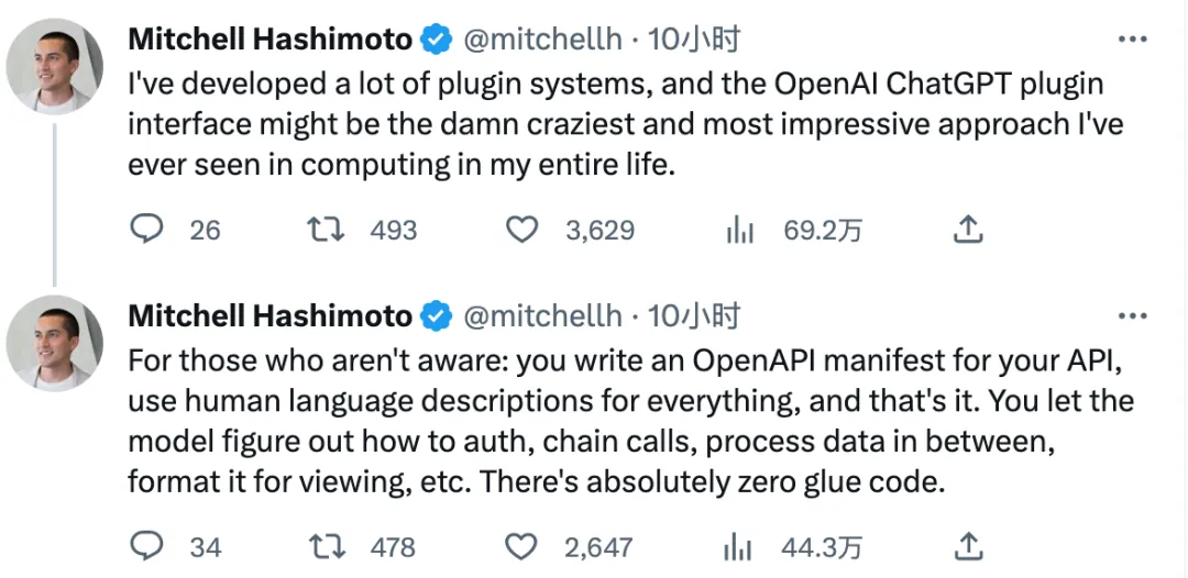 添加插件后的 ChatGPT 能力大大增强,英伟达 AI 科学家 Jim Fan 激动地表示:如果说 ChatGPT 的登场是“iPhone 盛会”,那么今天第三方插件的集成就是“iOS App Store”盛会。也有网友认为,“今天开始我们已经进入 Chat OS 时代,ChatGPT=iOS”。