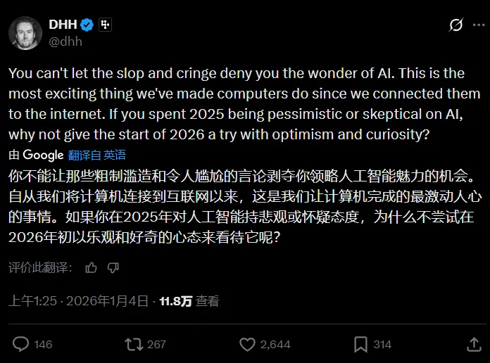 比如知名开源大佬、Ruby on Rails 之父 DHH(没错,就是那个两年前高调宣布告别K8s,去年夏天还在给大模型编程祛魅的技术狂人),几个小时前,也开始表示:2026,要乐观地拥抱AI了。