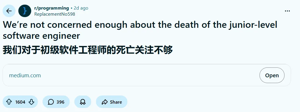 再比如,今天小编在Reddit上刷到一篇高赞热议文章:《初级软件工程师的消亡,我们关注得不够!》