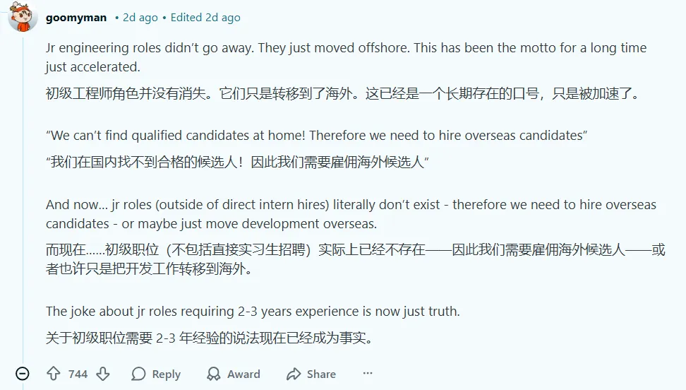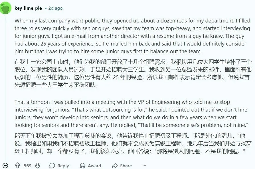甚至,一位网友讲述了一个更为扎心的招聘故事。工程VP在会议上,他被明确告知停止招聘大三和大四学生来培养初级工程师,那都是外包的活儿。