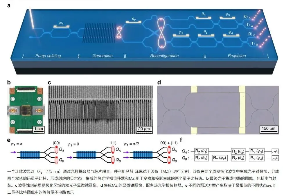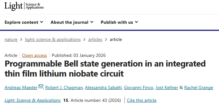 近日,苏黎世联邦理工学院的研究团队在《Light: Science & Applications》发表重要成果,成功在薄膜铌酸锂光子芯片上实现了可编程的纠缠贝尔态生成。该芯片集成了两个高亮度光子对源与可重构干涉单元,无需外部复杂光学系统即可直接制备多种量子态,保真度超过90%,标志着集成量子光子学向实用化、系统化迈出关键一步。光子系统是量子技术的前沿,可应用于量子计算、量子密码学或量子传感等领域,但传统基于铌酸锂的纠缠光子源虽亮度高却难以规模化,而集成光子学虽能实现规模化,此前的绝缘体上铌酸锂(LNOI)平台虽结合了铌酸锂的强非线性与集成优势,却仅停留在孤立器件或简单组合阶段,未实现 “高亮度光子源 + 可重构电路” 的全集成。本工作则将 LNOI 的功能单元整合为可编程电路,实现了片上高保真纠缠贝尔态的生成,推动了 LNOI 在可扩展量子光子系统中的应用。研究团队设计并制备了一款单片集成光子芯片,核心突破在于: