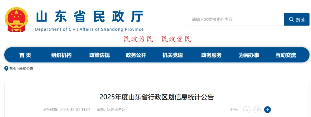 近日,山东省民政厅网站发布2025年度山东省行政区划信息统计公告,详情如下: