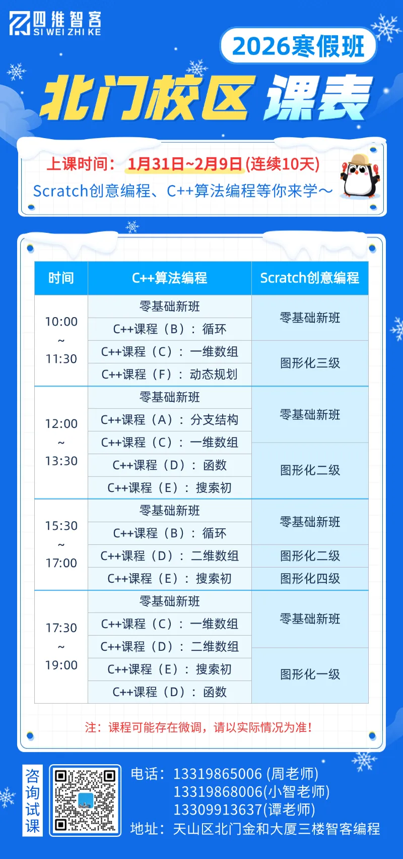 迈入2026年,我们的师资队伍再度壮大,在持续深耕教育质量的同时,智客教育始终坚持本土培育更多新疆地区的信息学奥赛种子选手,助力他们不断突破自我、冲击竞赛之巅!