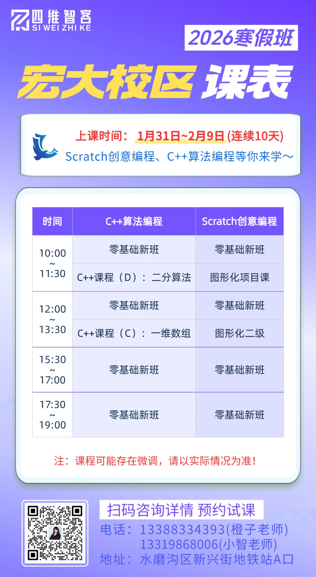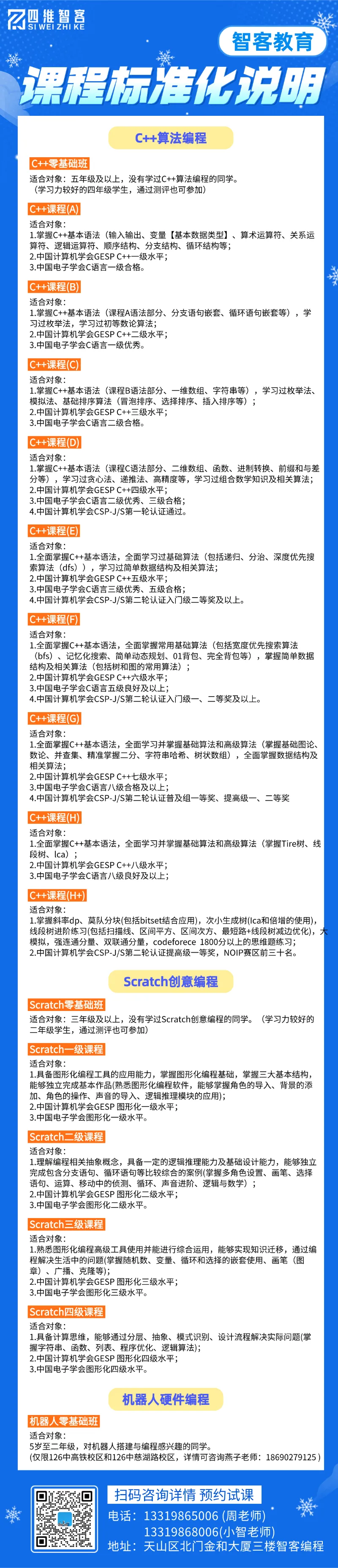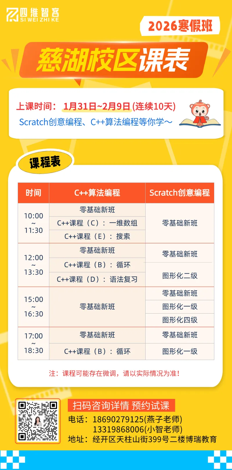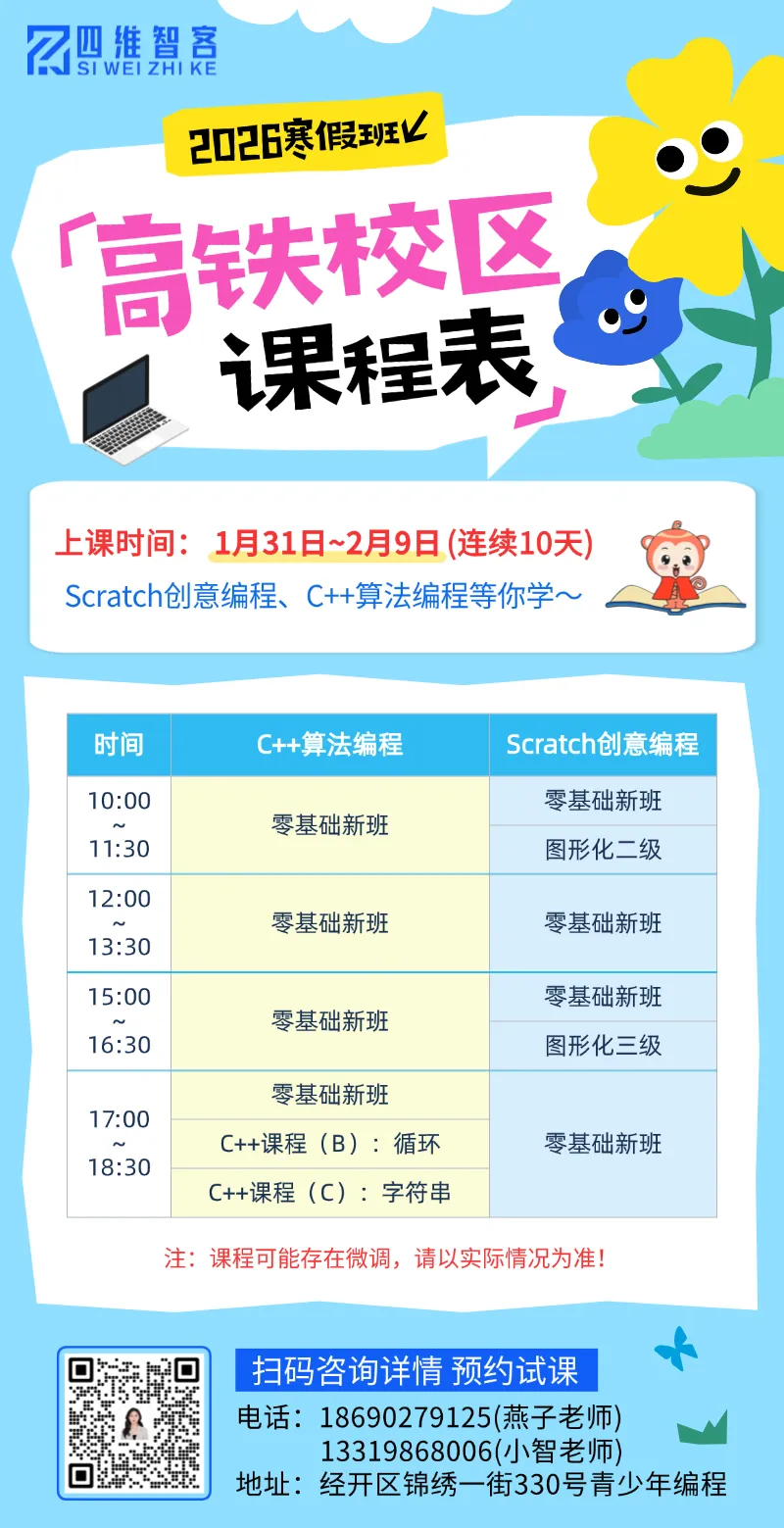 我们开设的C++课程全程以信息学奥赛(CSP-J/S)为导向,精准对接赛事考点。助力孩子们夯实编程功底、冲击赛事奖项,积累升学优势;同时也能培养严谨逻辑与问题解决能力,塑造终身受益的核心竞争力!