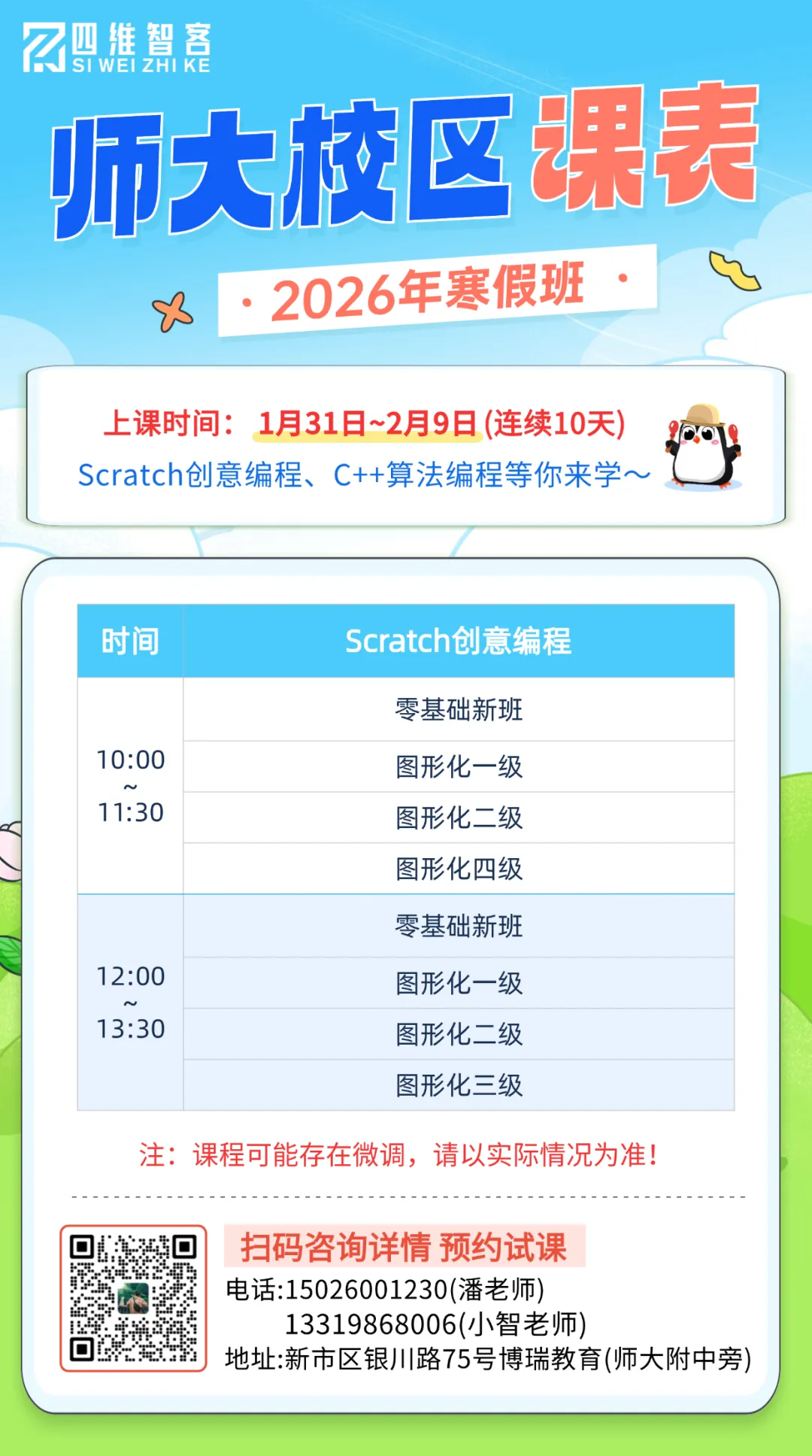 如果您对我们的课程感兴趣,欢迎随时联系我们。无论是课程详情、授课安排,还是孩子的学业规划、考级指导、科技特长生升学政策等,我们都能为您答疑解惑!