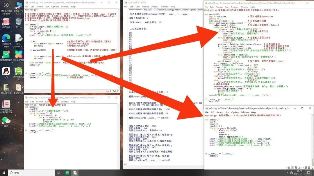 上图为 zxfcx8.py程序、被调用的程序及其运行结果截图,调用关系用红色箭头标示。