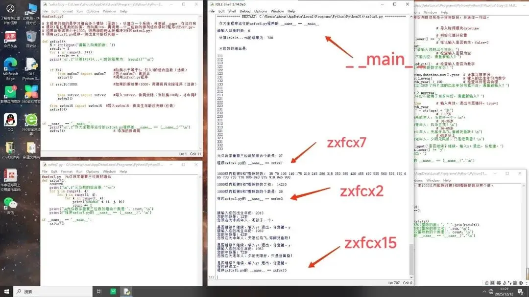 同时将直接运行程序“_ _ name _ _””的值和被调用程序“_ _ name _ _”的值,分别用红色箭头和文字标记。其中,直接运行的程序zxfcx8.py的“_ _name_ _”是“_ _main_ _”;被调用的程序zxfcx7.py、zxfcx2.py、zxfcx15.py“_ _name_ _”的值分别就是不带后缀的程序名: zxfcx7、zxfcx2、zxfcx15。(祥见下图)