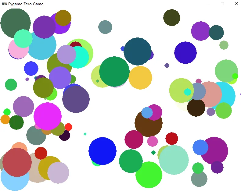 import pgzrun # 导入游戏库import random # 导入随机库WIDTH = 800 # 设置窗口的宽度HEIGHT = 600 # 设置窗口的高度balls = [] # 存储所有小球的信息,初始为空列表def draw(): # 绘制模块,每帧重复执行 screen.fill('white') # 白色背景 for ball in balls: # 绘制所有的圆 screen.draw.filled_circle((ball[0], ball[1]), ball[4], \ (ball[5], ball[6], ball[7]))def update(): # 更新模块,每帧重复操作 for ball in balls: ball[0] = ball[0] + ball[2] # 利用x方向速度更新x坐标 ball[1] = ball[1] + ball[3] # 利用y方向速度更新y坐标 # 当小球碰到左右边界时,x方向速度反向 if ball[0] > WIDTH-ball[4] or ball[0] < ball[4]: ball[2] = -ball[2] # 当小球碰到上下边界时,y方向速度反向 if ball[1] > HEIGHT-ball[4] or ball[1] < ball[4]: ball[3] = -ball[3]def on_mouse_move(pos, rel, buttons): # 当鼠标移动时 if mouse.LEFT in buttons: # 当按下鼠标左键时 x = pos[0] # 鼠标的x坐标,设为小球的x坐标 y = pos[1] # 鼠标的y坐标,设为小球的y坐标 speed_x = random.randint(1, 5) # 小球x方向的速度 speed_y = random.randint(1, 5) # 小球y方向的速度 r = random.randint(5, 50) # 小球的半径 colorR = random.randint(10, 255) # 小球的3个颜色分量 colorG = random.randint(10, 255) colorB = random.randint(10, 255) # 存储小球所有信息的列表 ball = [x, y, speed_x, speed_y, r, colorR, colorG, colorB] balls.append(ball) # 把该小球的信息添加到balls中pgzrun.go() # 开始执行游戏