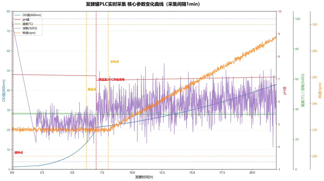 哈喽,各位生物制药 / 发酵工程的小伙伴~做发酵工艺复盘、批记录归档或工艺汇报时,一张清晰的发酵曲线不仅要展示 OD、pH、温度等核心参数,更要精准标注接种、降温、诱导、补料等关键工艺节点 —— 但很多人用 Python 绘图时,要么接种点被坐标轴覆盖,要么补料点文字位置混乱,标注效果大打折扣。今天就给大家分享一套发酵曲线绘制方案:基于 PLC 高密度采集数据,完美适配疫苗 / 兽药发酵场景,不仅能精准生成 5 大核心参数曲线,还能清晰标注所有工艺关键点,解决标注显示不全、位置混乱的痛点,生成的曲线可直接用于 GMP 批记录和工艺汇报!
