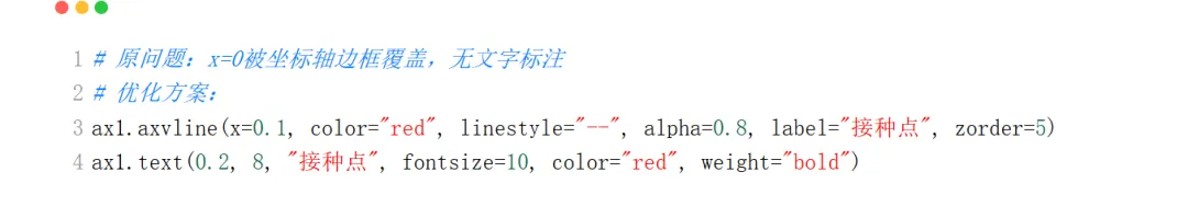 ✅ x=0.1:轻微右移避开坐标轴边框,肉眼仍判定为 0h 接种点;✅ zorder=5:让标注线条在所有曲线最上层,不被覆盖;✅ y=8:适配 OD 上限 80 的 10% 位置,醒目且不遮挡曲线。2. 多关键点标注混乱?—— 分色 + 分层定位