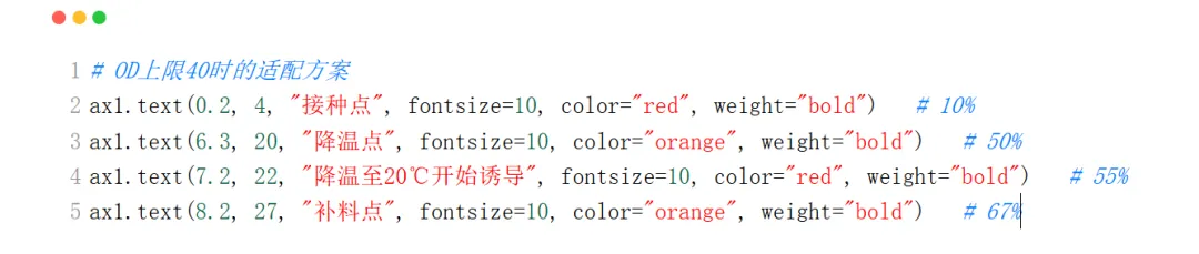 ✅ 颜色区分:接种 / 诱导用红色,降温 / 补料用橙色,视觉分类清晰;✅ 位置分层:不同关键点文字 y 值递增(8→40→45→54),避免重叠;✅ 文字加粗:weight="bold"提升辨识度,适配汇报投影展示。3. 文字位置适配不同 OD 范围?—— 按比例定位