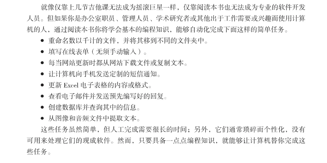 “对于有烦琐任务且不想花费数小时手动处理的人来说,《Python编程快速上手:让烦琐工作自动化》再合适不过了。”