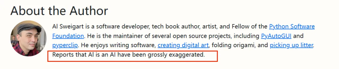先看他的行业硬实力。作为Python软件基金会会士,他本身就是Python社区的权威人物,这一身份让他的教程自带“靠谱”背书;同时他还是资深软件开发师,一手打造了PyAutoGUI、pyperclip等热门开源模块,这些工具在GitHub上收获上万个星标,被无数开发者实际使用,足以证明他的技术功底。