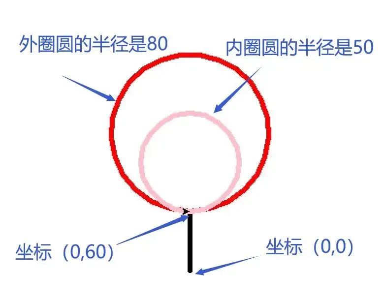 (2)根据图1中的参数,画出内外两个圆;外圈的半径是80,内圈的半径是50;