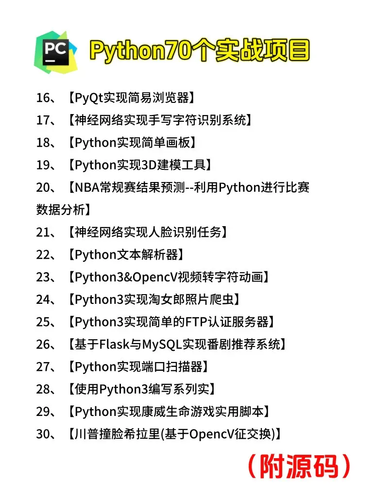 今天给大家整理的70个项目,大家可以一边动手操作,一边学习❗❗好记性不如烂笔头 练完相信会对你的Python技术有不小的提高。