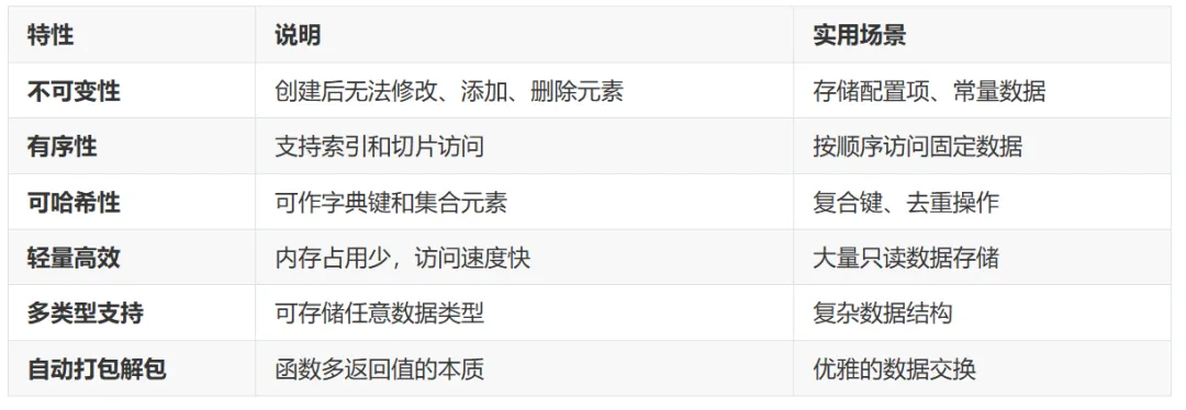 1.数据安全:防止意外修改2.哈希支持:可作字典键3.性能优化:内存占用小,访问速度快4.线程安全:无需加锁保护